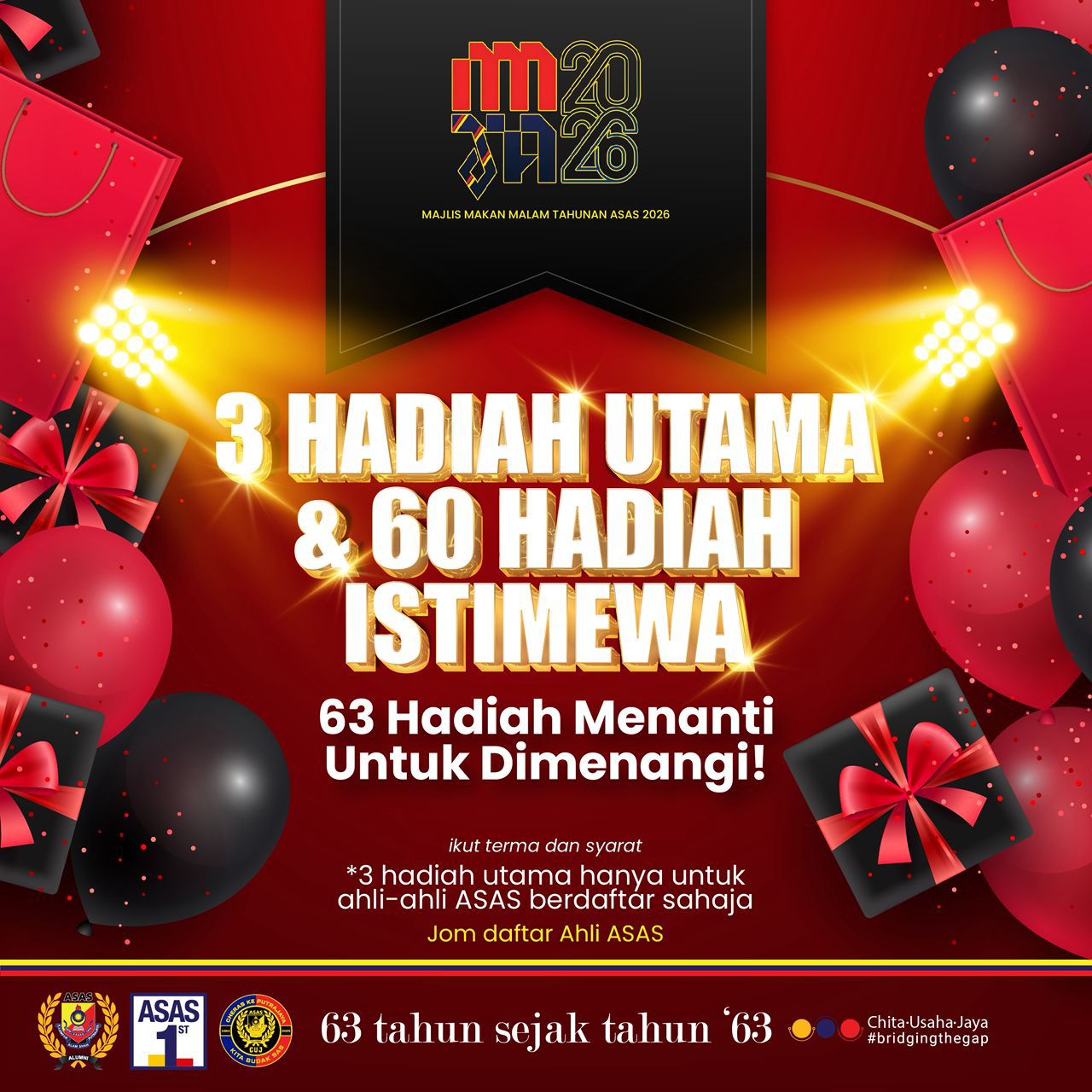 Sukacita kami ingin maklum bahawa sempena sambutan ulang tahun penubuhan SAS ke-63, terdapat 63 hadiah cabutan bertuah menarik akan diberikan kepada warga ASAS yang bertuah pada MMMTA2026 nanti.