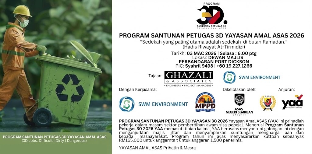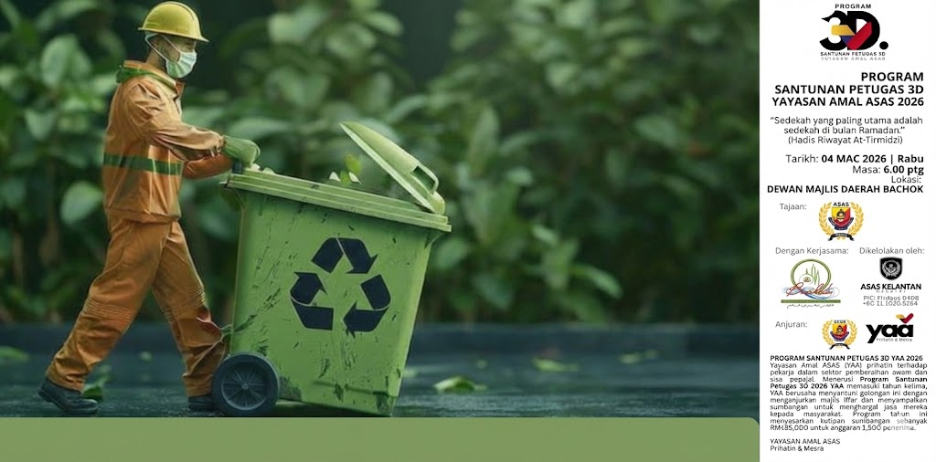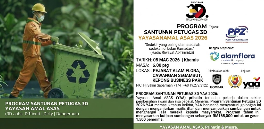 Program Santunan Petugas 3D Yayasan Amal ASAS. Warga ASAS yang berada di kawasan sekitar di jemput hadir Program Santunan Petugas 3D Yayasan Amal ASAS 2026 Tarikh : 05 Mac 2026 – Khamis – 6.00 petang Lokasi : Pejabat Alam Flora Cawangan Segambut Assalamualaikum dan selamat sejahtera kepada sahabat Yayasan Amal …