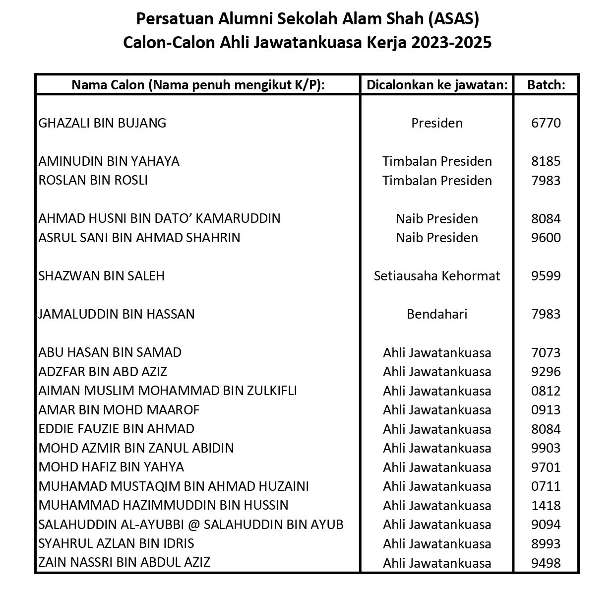 * Senarai nama adalah mengikut jawatan yang dicalonkan, juga mengikut turutan abjad