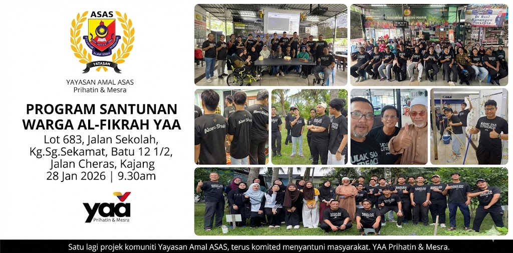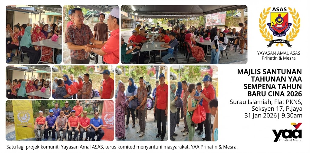 Assalamualaikum sahabat-sahabat ASAS yang dikasihi. Program YAA hari ini 31/1/26 1. Santunan Masyarakat Asnaf di Flat PKNS Section 17 Petaling Jaya, bertempat di Surau Islamiah. Terimakaseh kepada Bashir Razak 9599 yang menguruskan majlis. Alhamdullillah penduduk Melayu & China duduk sama-sama semeja mengambil sarapan 2. Kelas Bahasa Inggeris ‘PEARL’ di tiga …